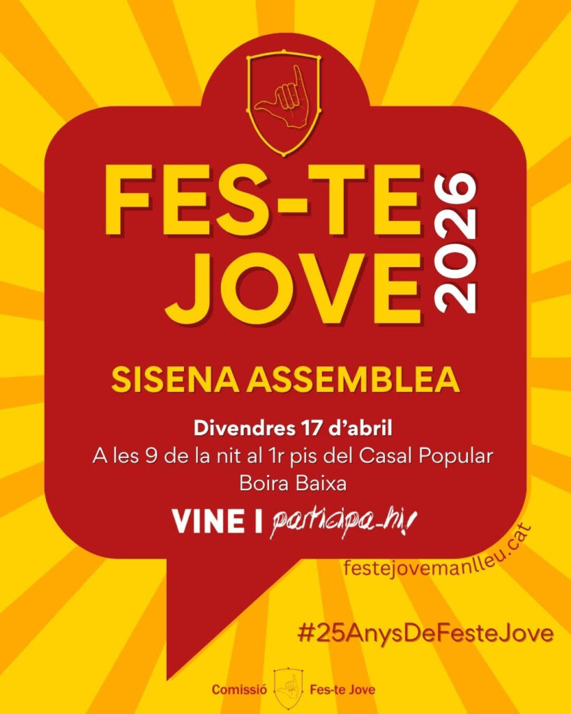Aquest divendres 17 d’abril es celebra la sisena assemblea dels vint-i-cint anys de Fes-te Jove. Us esperem a totes al primer pis del Casal Popular Boira Baixa.